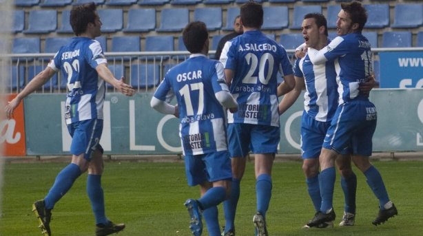 Alaveseko jokalariak atzoko bi goletako bat ospatzen. JOSU CHAVARRI /NOTICIAS DE ALAVA