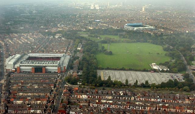 - Anfield ezkerrean, eta Goodison eskuinean, gorago. Bien artean, Stanley Park zelaia.
